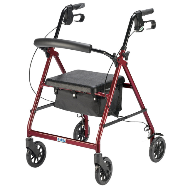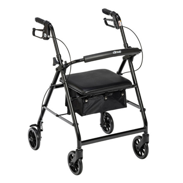 Light Weight folding rollator with a padded seat. Comes with hand brakes and a safety bag under the seat. Folds easily with 6″ casters. Only 13 lbs!
